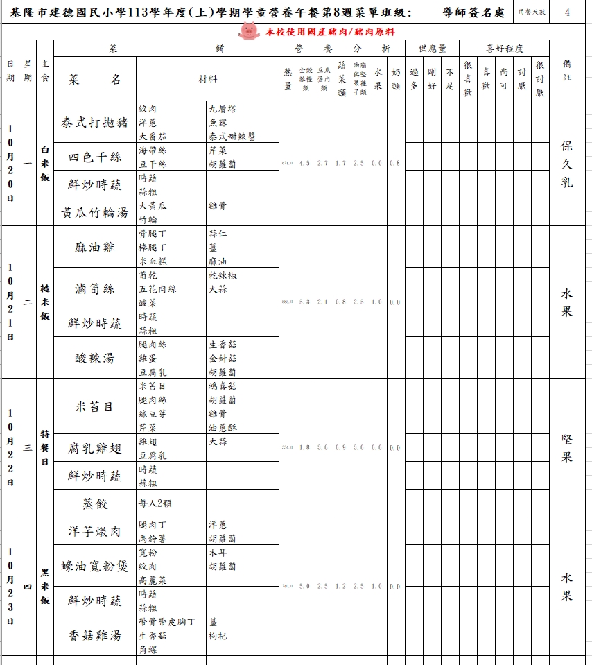 建德國小114學年度第1學期第8週(114年10月20日-10月24日)營養午餐菜單