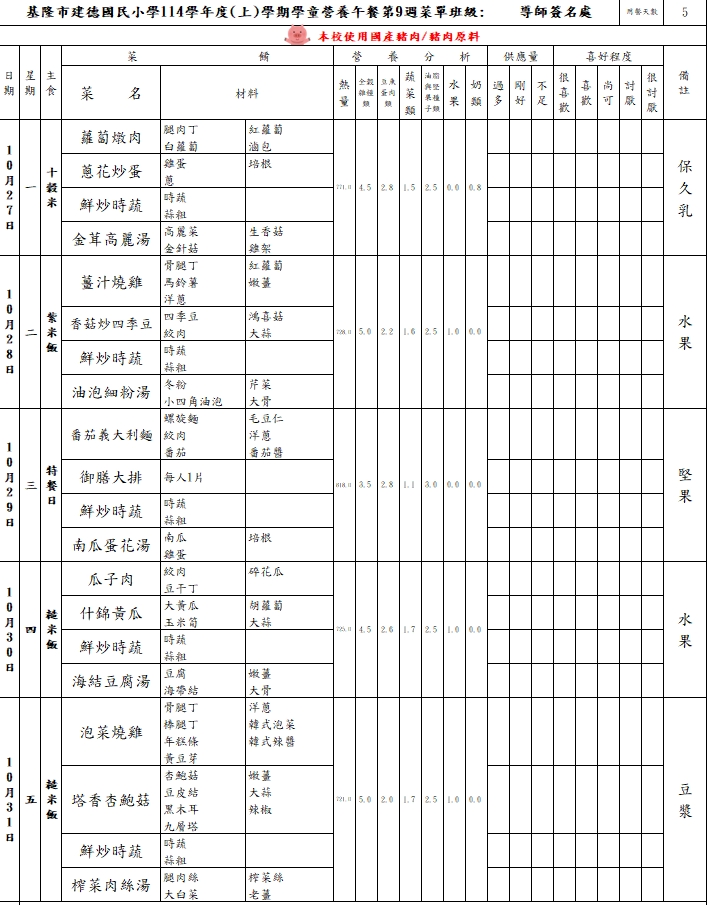 建德國小114學年度第1學期第9週(114年10月27日-10月31日)營養午餐菜單,詳見附檔。