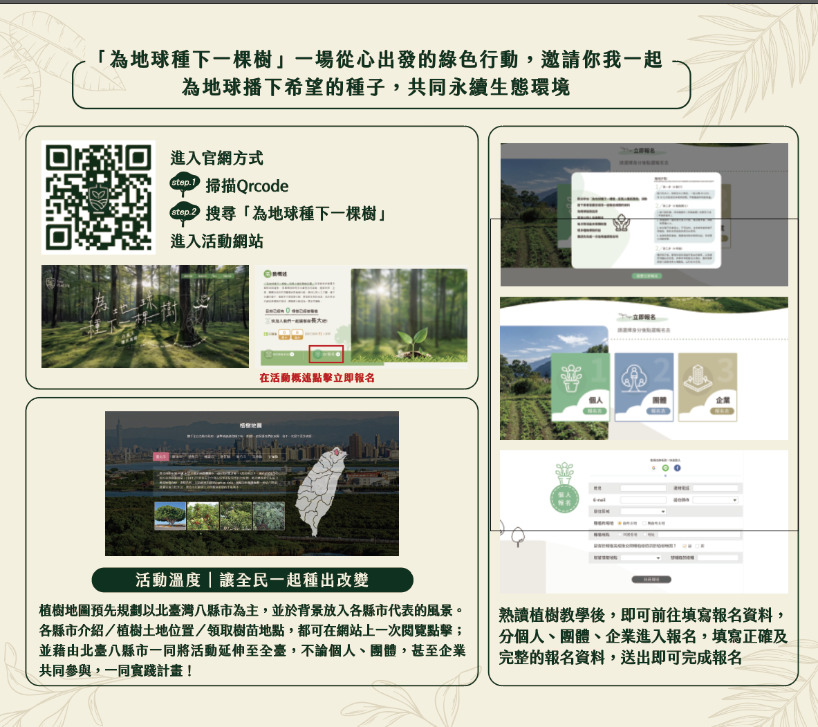 動,邀請民眾、企業、團體及政府共同響應參與植樹行